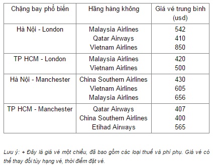 Sau đây là bảng giá vé của một vài hãng máy bay đi Anh phổ biến, quý khách có thể tham khảo: